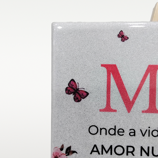 • Impressão: Sublimação, que garante cores vibrantes e destacar os brilhantes presentes na base do azulejo.